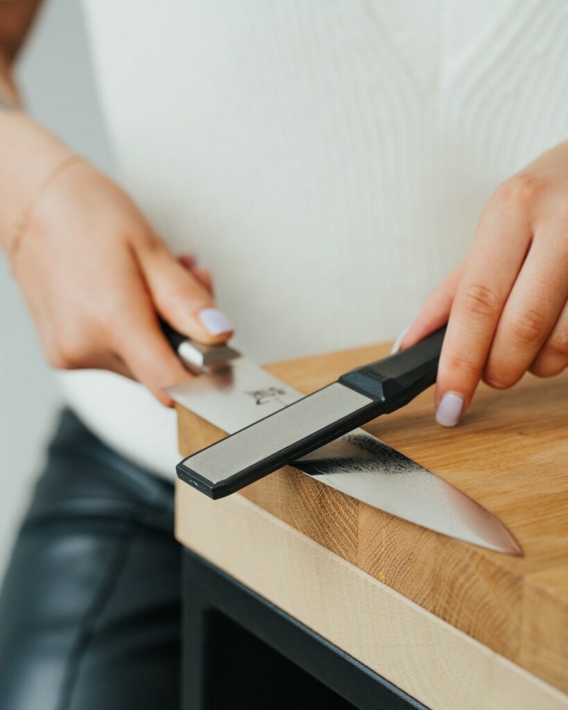 Hyvä keittiöveitsi tulee pitää terävänä ja siksi mukana kannattaa kulkea joku veitsenteroitin. Chez Mariuksen kaksipuolinen timanttilasta sopii kaikkien keittiöveitsien teroittamiseen, on helppo ja nopea käyttää sekä pienen kokonsa ansiosta kulkee näppärästi mukana!