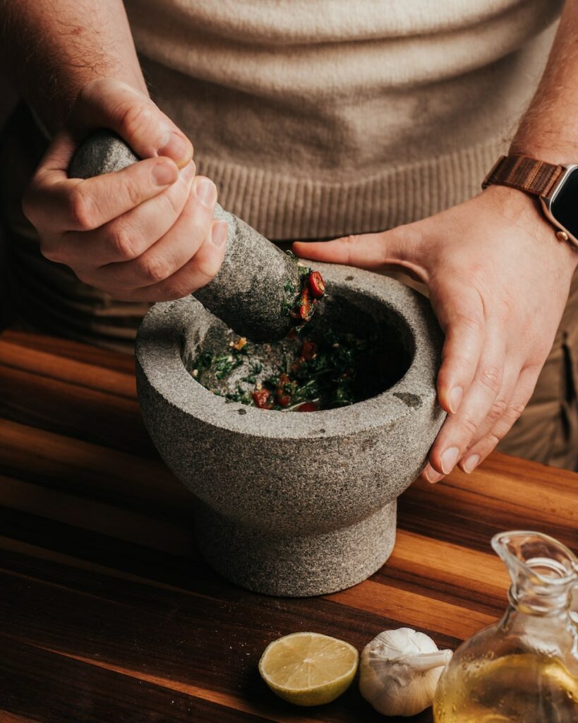 Yleisimmin morttelit valmistetaan joko kivestä tai marmorista, mutta myös keraamisia, teräksisiä ja valurautaisia vaihtoehtoja löytyy markkinoilta. Lähtökohtaisesti mitä karheampaa ja painavampaa materiaalia mortteli ja sen survin on, sitä helpommaksi se tekee raaka-aineiden murskaamisen, eli jos morttelin paino ei ole ongelma, kannattaa suosia kiveä, marmoria tai valurautaa. Koon puolesta mitä suurempi mortteli on, sitä helpommaksi se tekee työskentelyn, sillä raaka-aineet pysyvät morttelissa sisällä eivätkä lentele pitkin pöytiä. Tämän blogin kuvituksessa käytetty Gefun Crunchy -graniittimortteli on kaksipuolinen, jonka suurempi kulho on kätevä esim. lehtevien yrttipuskien murskaamisessa, kun taas pienessä kulhossa tulee näppärästi vähäinen määrä kuivamausteita.