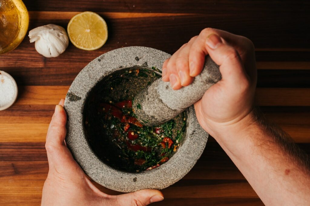 - Caesarsalaatin kastike – myös muiden salaatinkastikkeiden, aliolin ja vinaigrettien emulgointi käy morttelissa jauhamalla ensin kiinteät raaka-aineet ja lisäämällä öljyä pikkuhiljaa