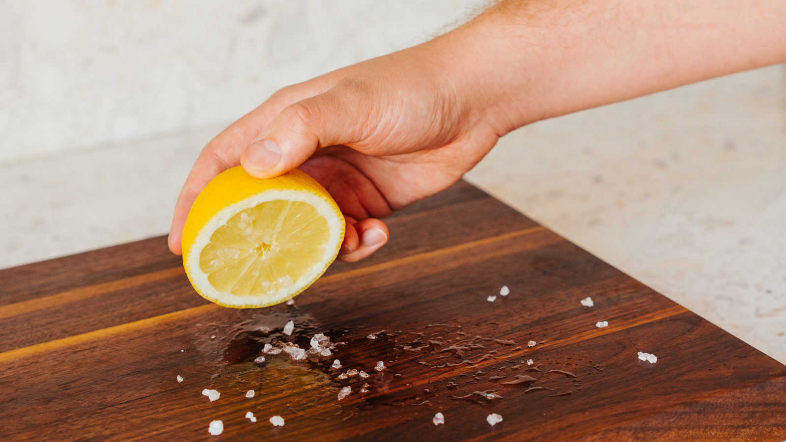 Jos lautaan imeytyy värjäytymiä tai ei toivottuja hajuja, ripota laudan pinnalle karkeaa merisuolaa ja hiero suolaa puoliksi leikatun sitruunan leikatulla sivulla.