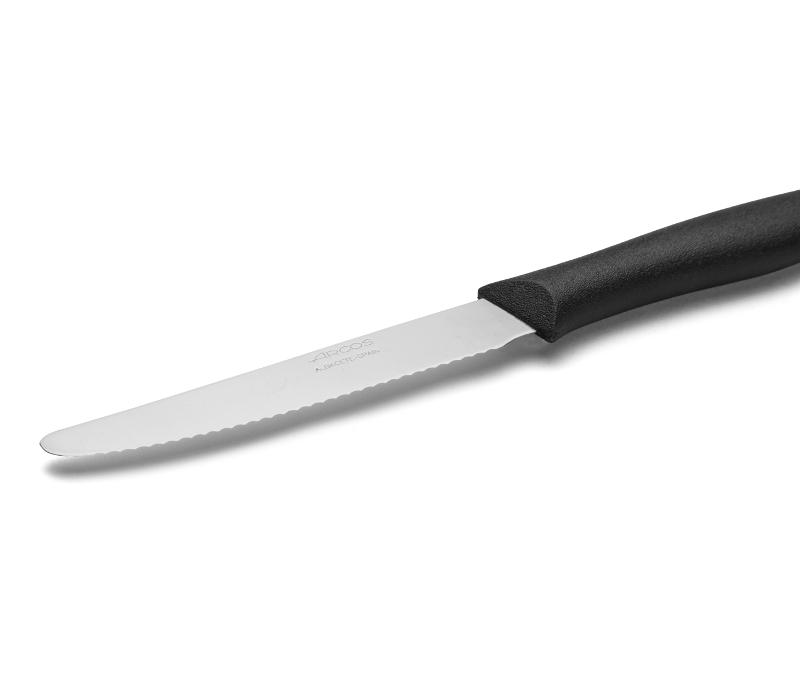 Edullinen pieni sahalaitainen veitsi vaikkapa aamupalapöytään. Sahalaitaisella terällä leikkaa helposti nätit viipaleet voileipäkurkuista ja -tomaateista. Arcos veitset ovat loistavan hinta-laatusuhteen omaavia ammattitason työvälineitä. Vuodesta 1745 espanjalaisella veitsentaontaperinteellä Albaceten maakunnassa valmistetut veitset ovat Nitrum- ruostumatonta terästä, jonka kovuus Rockwellin asteikolla on C56. Teräs valmistetaan myös Espanjassa. Arcos veisten kahva on pitävää ja kosteuden kestävää polyoxymethylene-muovia (POM) ja sen niitit käyttöä kestävää ruostumatonta terästä. Kahvat valetaan ja kiinnitetään veitsiin Arcoksen omassa tehtaassa. Valmistaja: Arcos Terän pituus: 11cm Materiaali: NITRIUM-ruostumaton teräs, polyoxymethylene-muovi Väri: Musta Paino: 25g